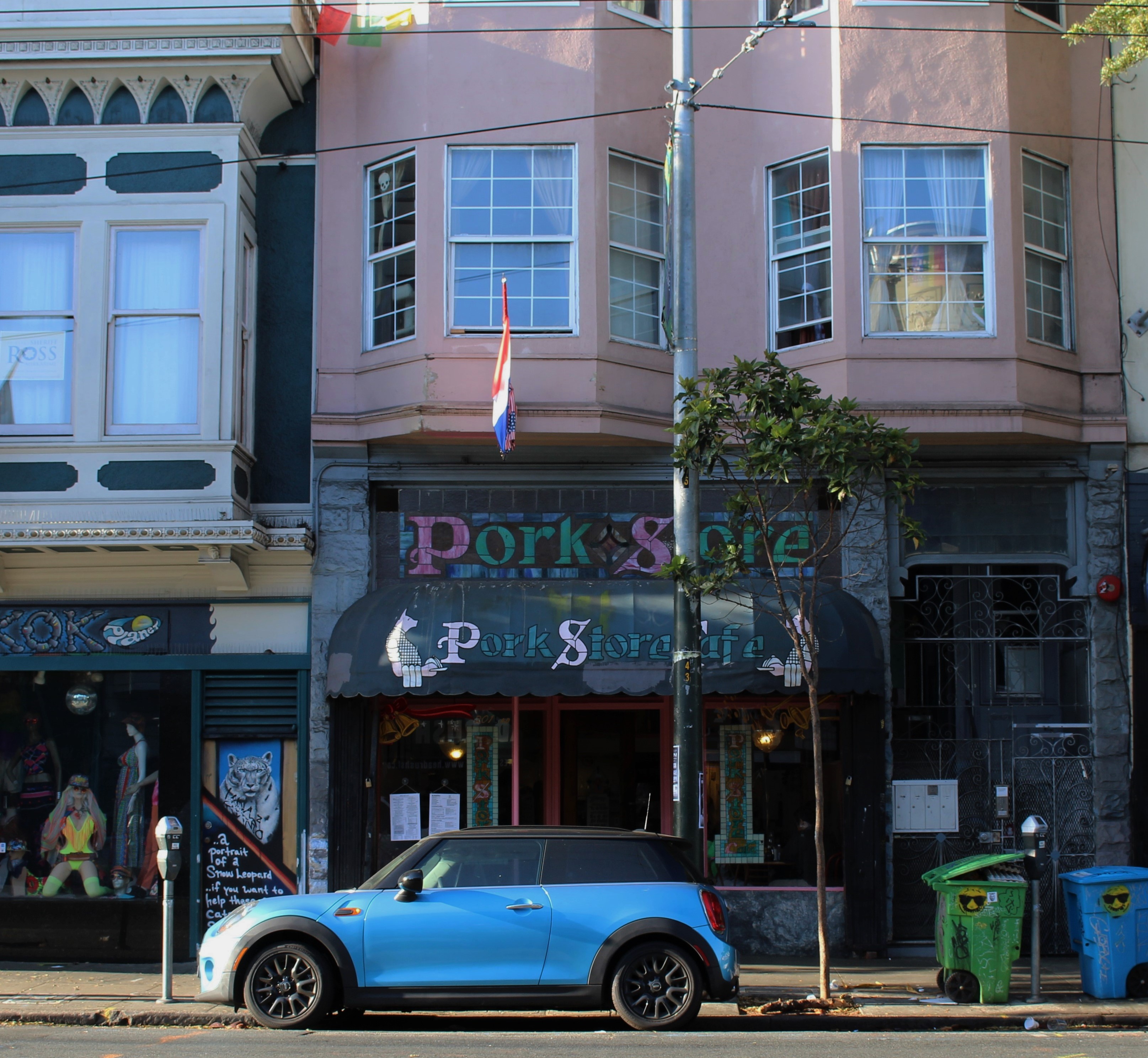 On our last morning in San Francisco we LYFTed to Haight Street. We met my friend and fabulous photographer, Debra, for breakfast at the Pork Store. I LOVE the name. It was a cute little place decorated with vintage posters. The stained glass over the entrance is really amazing. We were there early so we had our pick of seats. We chose the front window for the view. Not much happening on Haight at 8:30 AM on a Monday.