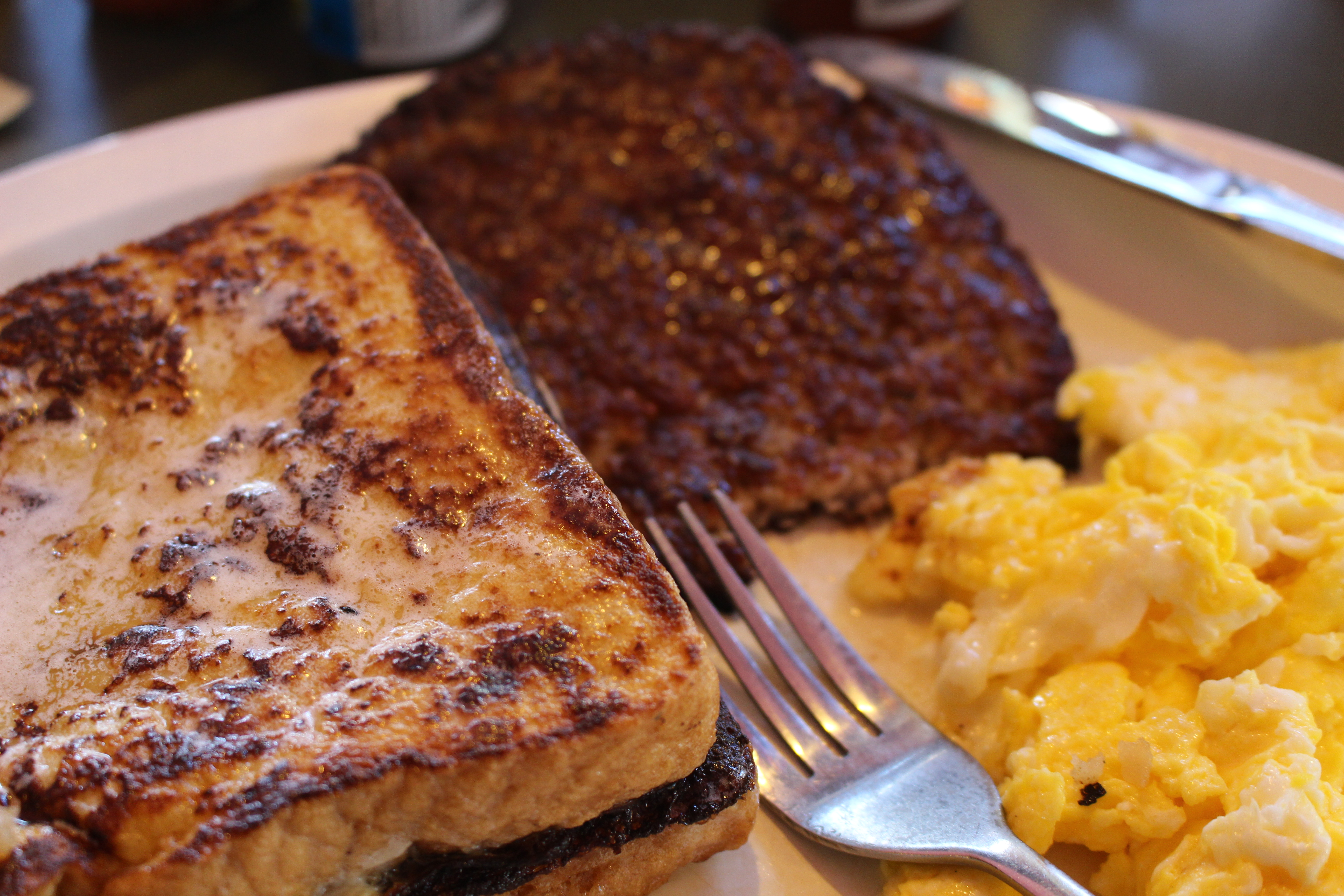 I ordered the piggy special. Two eggs with french toast and sausage. The eggs were scrambled perfectly and yummy. One of the slices of french toast was overcooked but the other was really tasty. Look at that buttery syrup! I was so excited about the sausage because I could tell it was freshly made and it was huge! Unfortunately, it was too salty. The coffee was bold and bottomless. I give the Pork Store 3.5 out of 5 oinks.